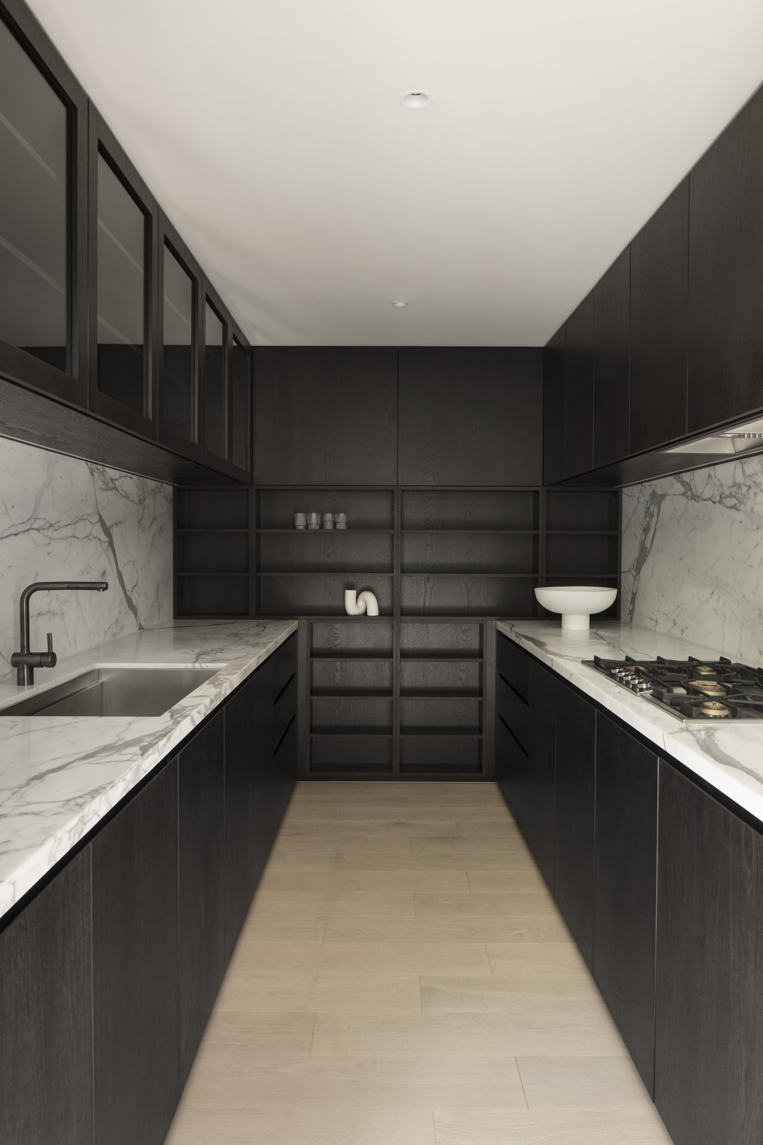 The sleek, luxe kitchen features a minimalist aesthetic with its Smoked oak timber veneer cabinetry encasing a honed Storm marble to create a stand out visual feature. Floor-to-ceiling cabinetry provides a lovely element of height while subtly emphasising the stunning windows and lightness of the space.