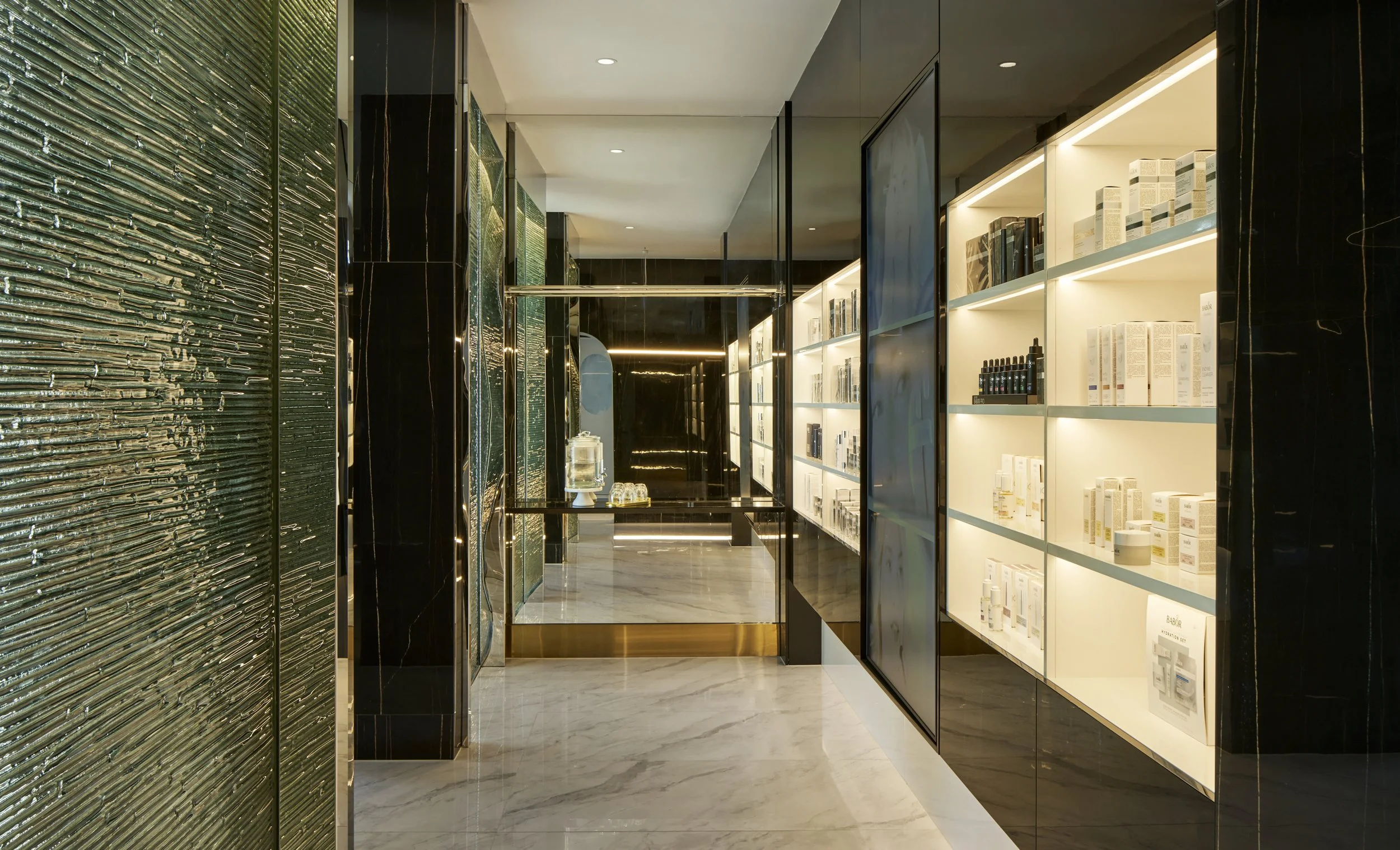 Lighting needed to be functional but also visually appealing. Recessed task lighting, alongside concealed LED light strips on retail shelves, provides a practical finish. Custom suspended pendant lights in the reception, waiting rooms, and treatment rooms give an element of warmth while underscoring the entire project's magnificent design and feel. In addition, the wall light sculpture, which is also dimmable, can be easily adjusted to suit the day's needs regardless of the available natural light outside.