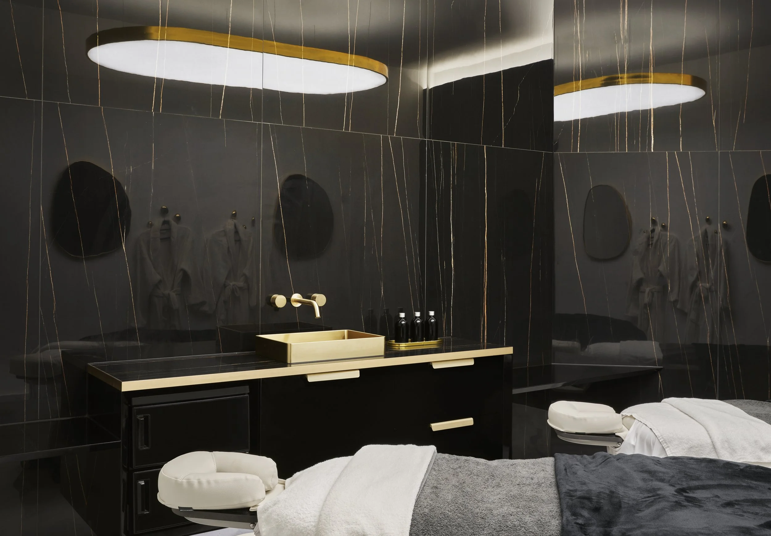 This design project had to carefully consider lighting, fixtures, and finishes. Combining plenty of glass alongside interesting focal points of metal cladding and high-end solid brass has provided a magnificent spa environment. Joinery in brass adds to the contrast against the Duchess Satin paint finish, while sprayed aqua gold on the walls breaks up the deep hues of the room and enhances the brass accents beautifully.