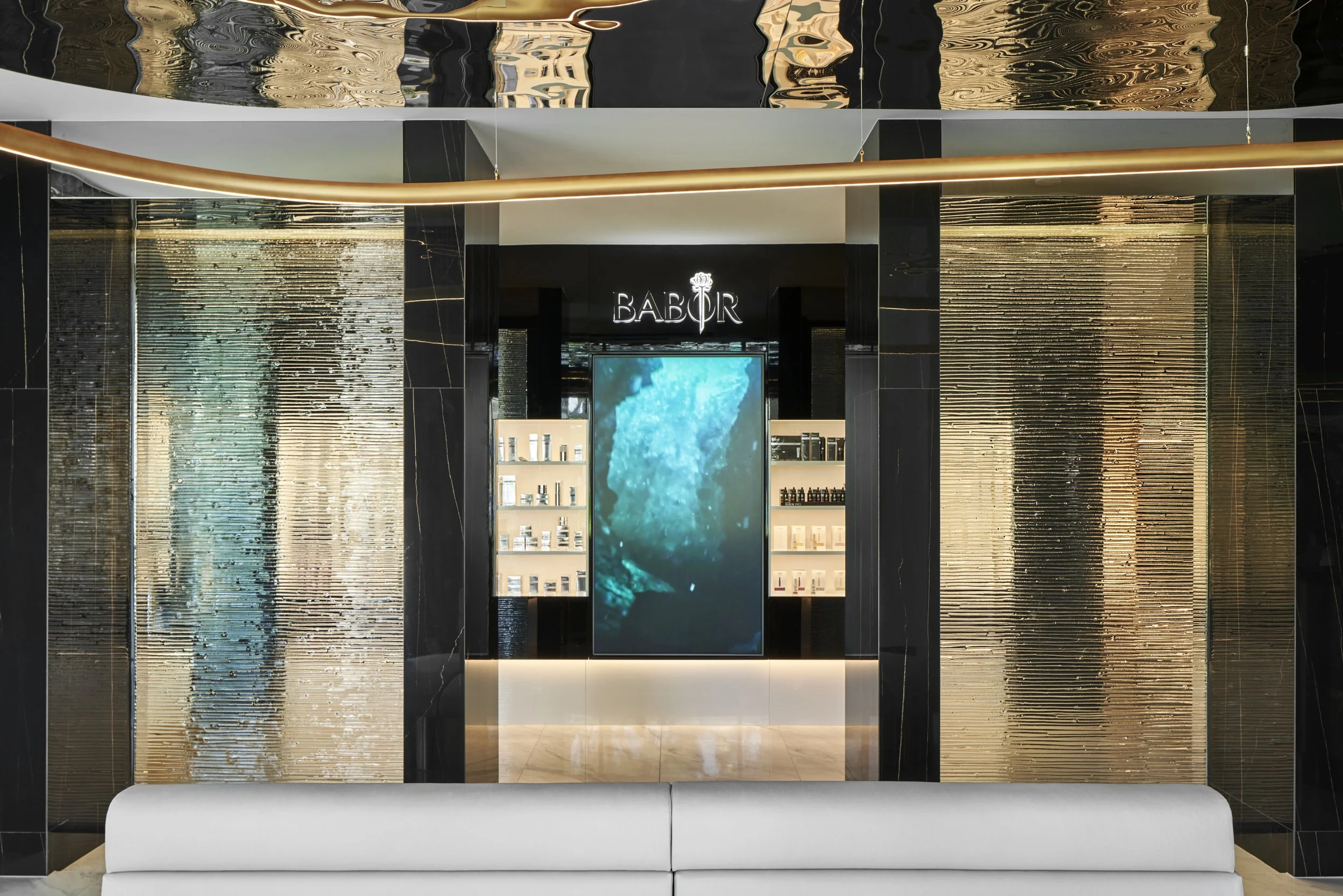 The big wave metal panel, in polished mirror finish, offers a gorgeous focal point in this project. Dark, bold and beautiful, this space presents modern charm and flair without compromising the functionality that is vital for such a well-known and opulent spa.